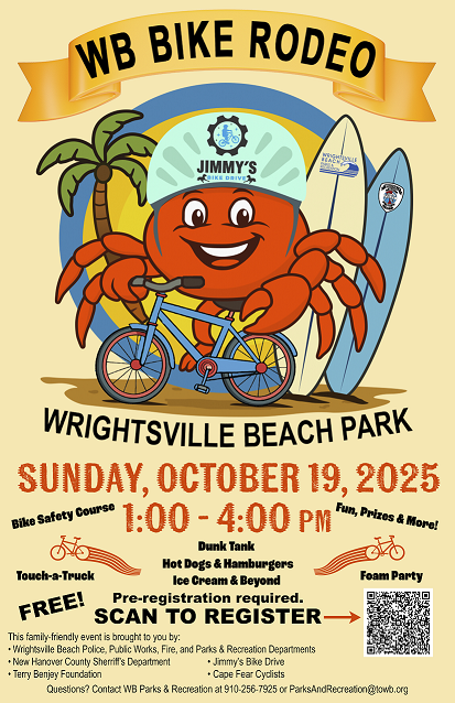 Join us in Wrightsville Beach Park for an afternoon of family fun at the first annual Wrightsville Beach Bike Rodeo. Children are invited to participate in a bike safety obstacle course where they will practice balancing, stopping, and turning as well as following traffic rules. The course is lead by Tammy Swanson, safety instructor for Cape Fear Cyclists and the Terry Benjey Foundation. Please bring your bicycle and helmet. We'll tune your bike and check your helmet for proper fit. No bike or helmet? No worries - we'll have one for you to use.
